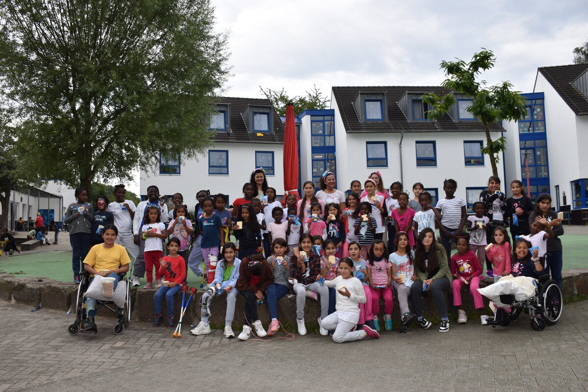 Am 02.08.2024 ist der Tag des Eiscreme-Sandwichs. Dieser etwas kuriose Feiertag brachte die Projektgruppe "wenco hilft" auf die Idee, die schon geplante Sachspenden-Übergabe am 01.08.2024 für die Kinder im Friedensdorf zu etwas ganz Besonderem zu machen. So kamen zu den Spendenkartons noch einige Kühlboxen mit geheimnisvollem Inhalt dazu. Als die Kinder diese Boxen und die bunten Outfits unserer Mitarbeiterinnen sahen, waren sie schon ganz aufgeregt. Nach dem Mittagessen gab es dann kein Halten mehr: Für alle rund 200 Kinder gab es leckeres Sandwich-Eis!