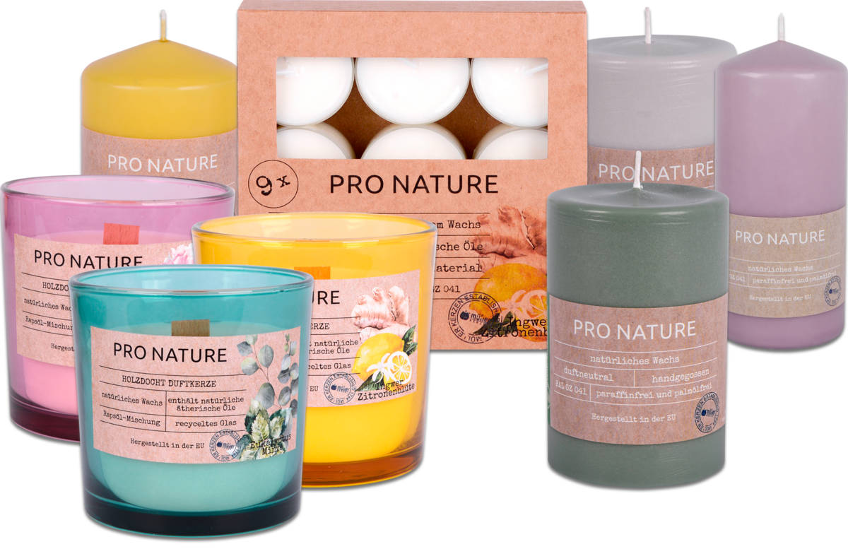 Auch im Bereich der Kerzen greifen wir das Thema Nachhaltigkeit auf und setzen dies um. Mit der neuen Serie Pro Nature bieten wir verschiedene Kerzen aus natürlichen oder nachhaltigen Rohstoffen sowie aus recyceltem Verpackungsmaterial.